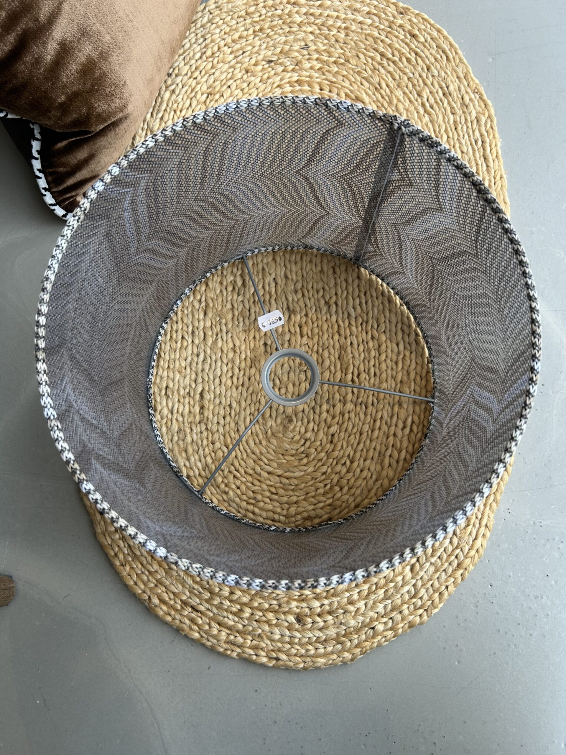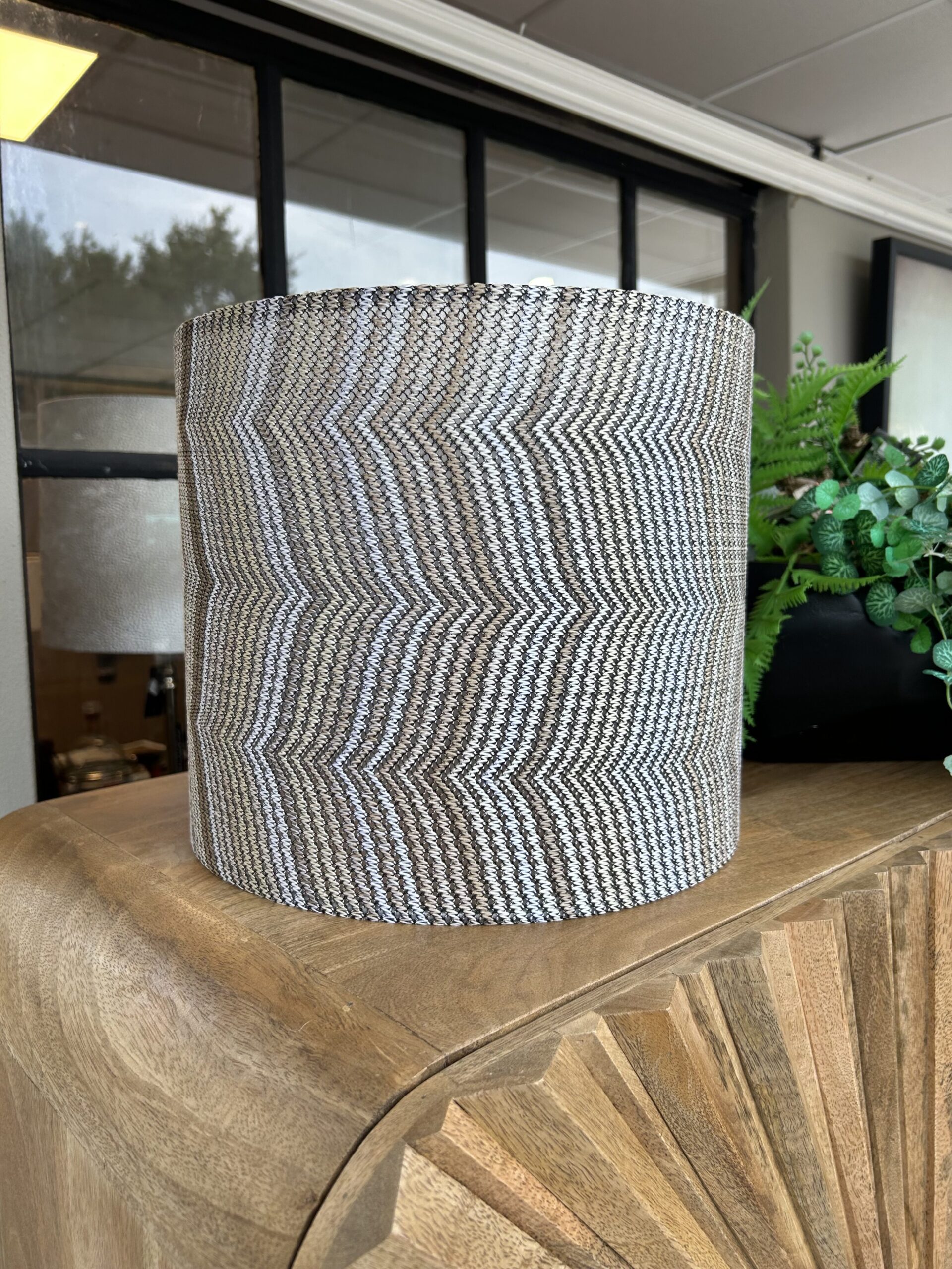 Een cilindervormige lampenkap met een opvallend zigzag patroon in aardse tinten, afgewisseld met subtiele accenten in lichtblauw en wit en bruin. De geweven structuur geeft een speelse vintage uitstraling, waardoor de kap zowel in een modern als retro interieur past.