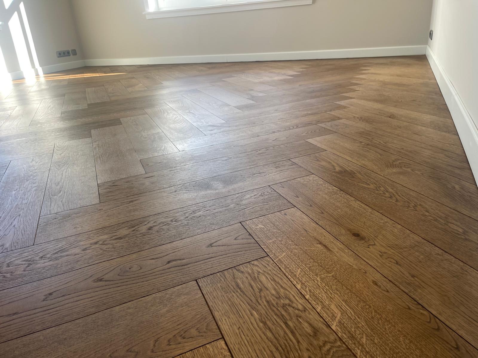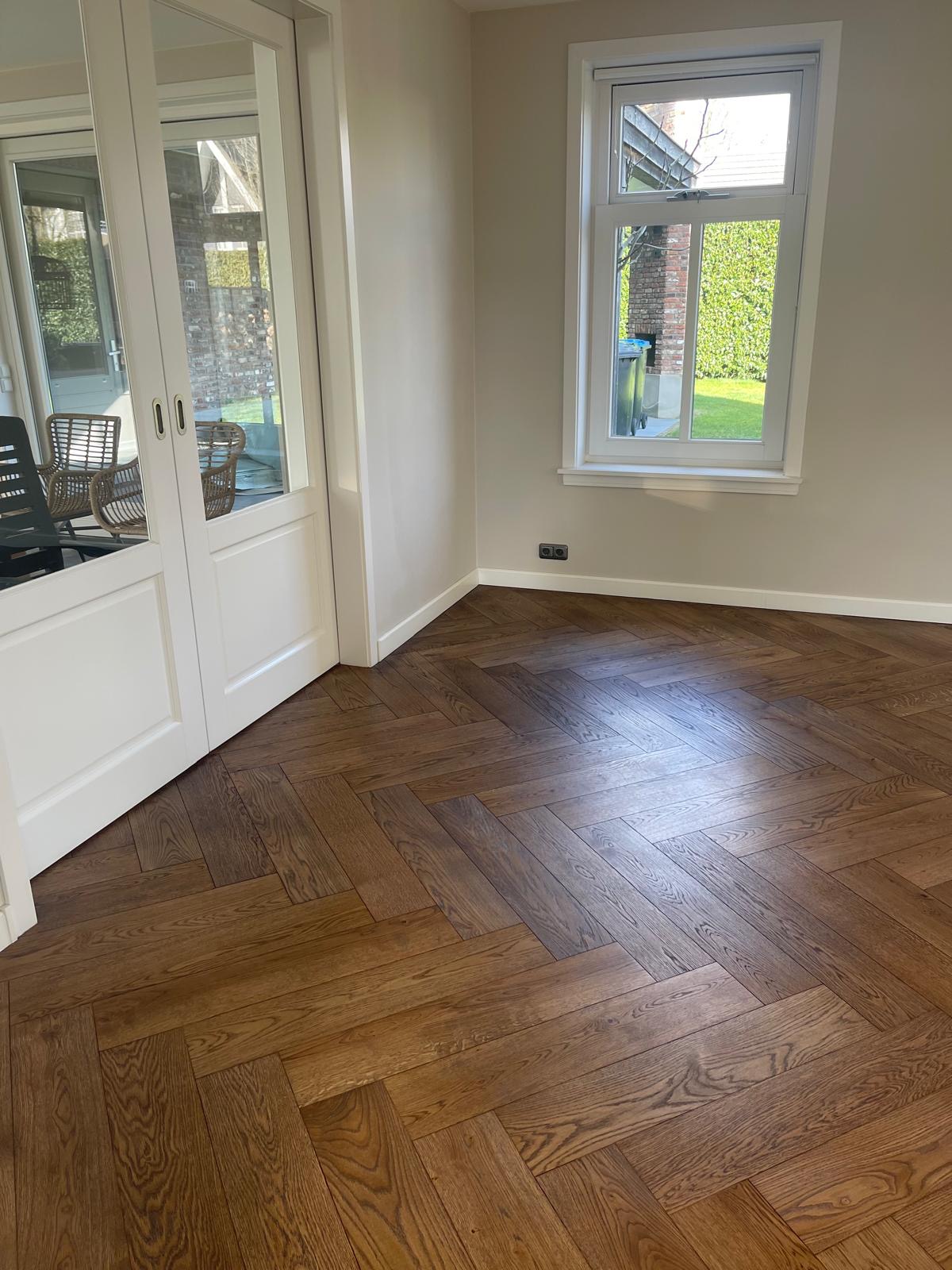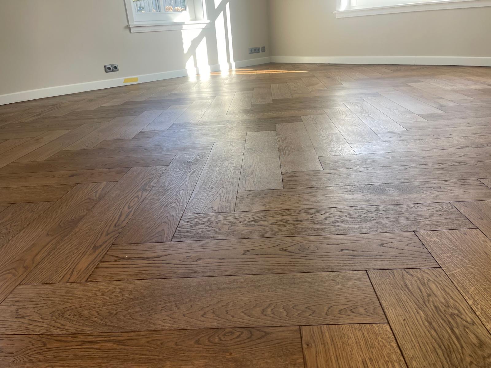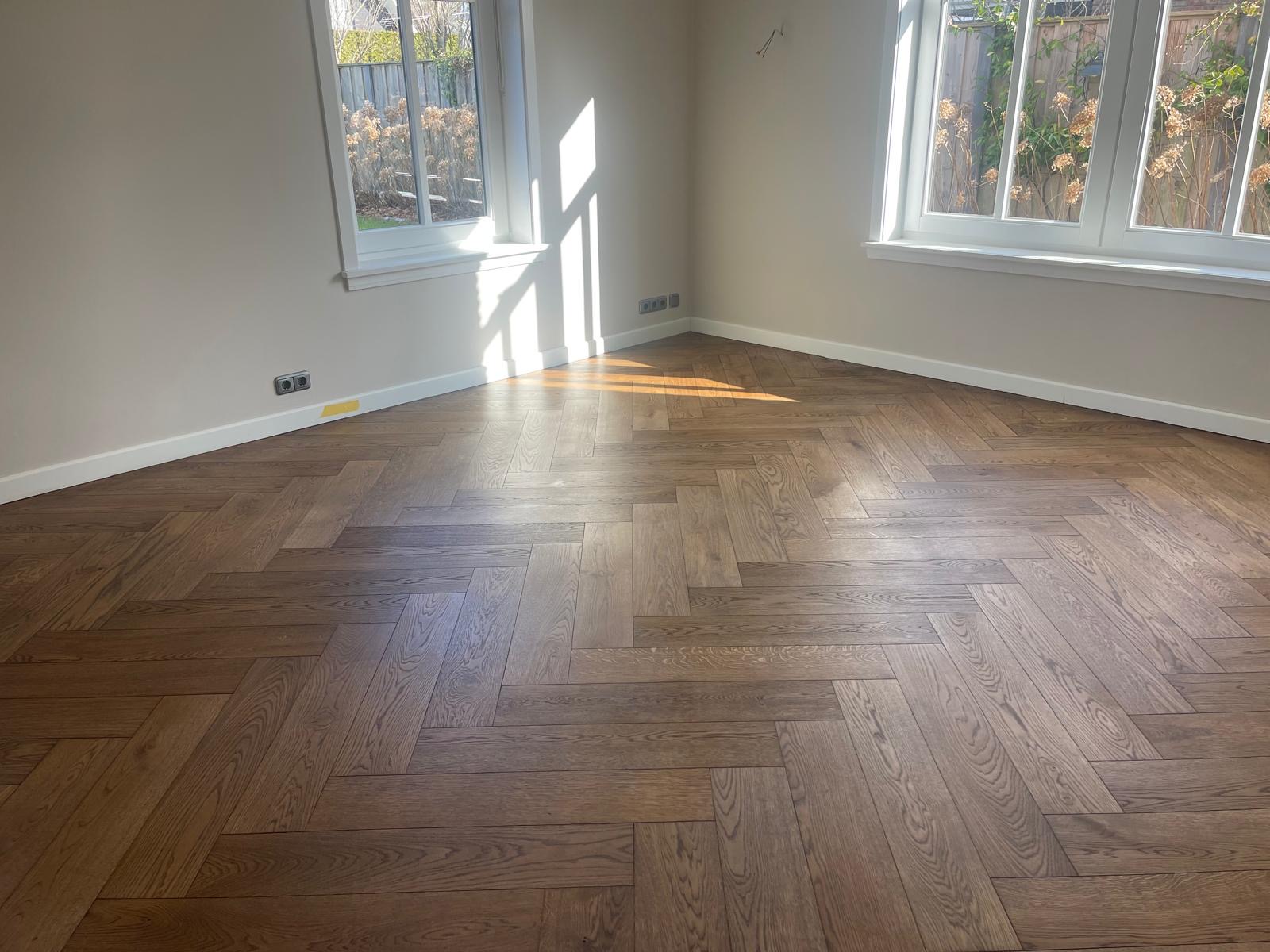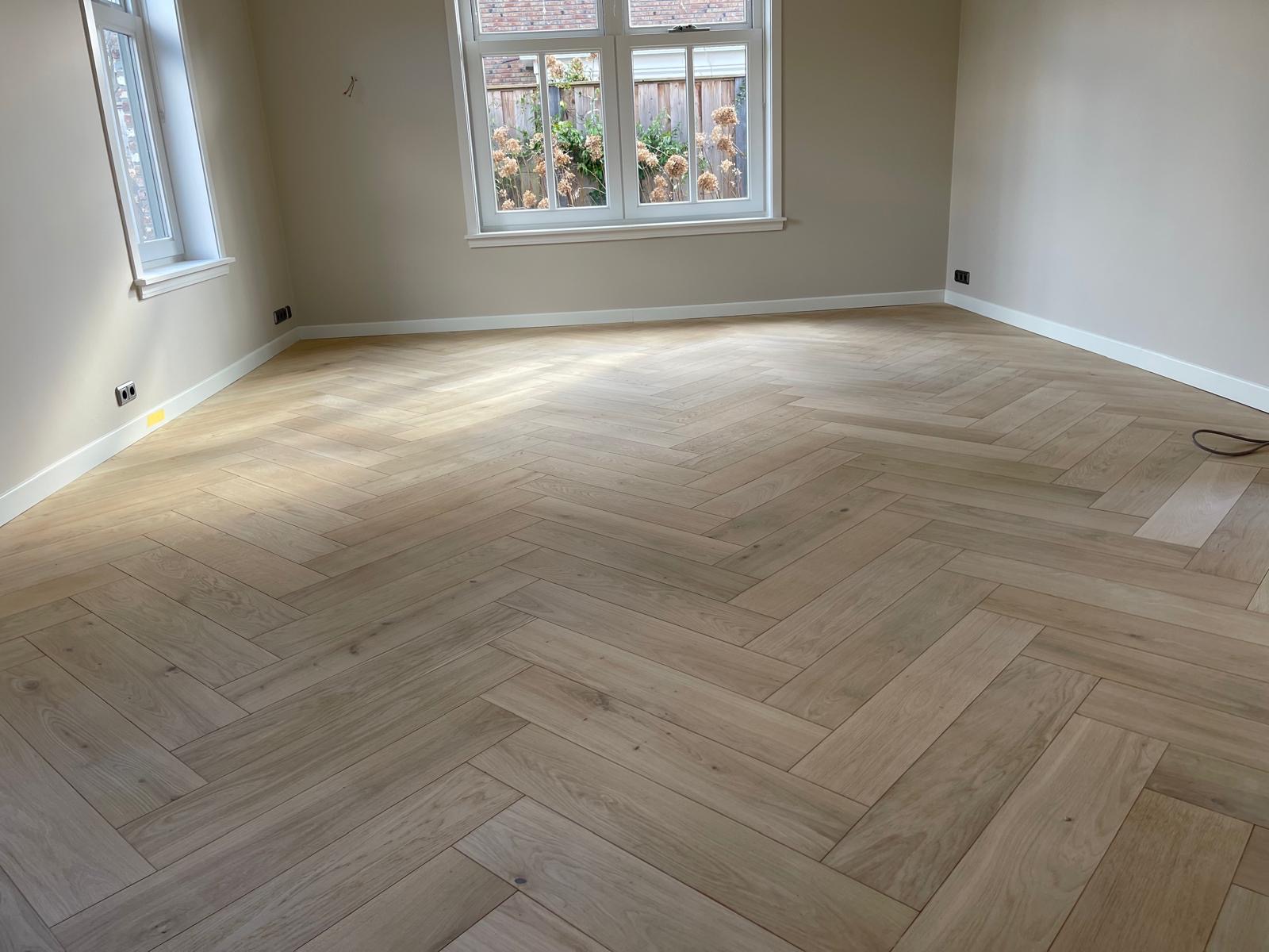 De keuze voor de kleur was snel gemaakt: de klant ging voor de prachtige, natuurlijke tint Beachwood. Daarnaast is er gekozen voor een royaal formaat visgraat, met planken van 18 cm breed en 70 cm lang. Dit geeft de ruimte een rustige en stijlvolle uitstraling.
